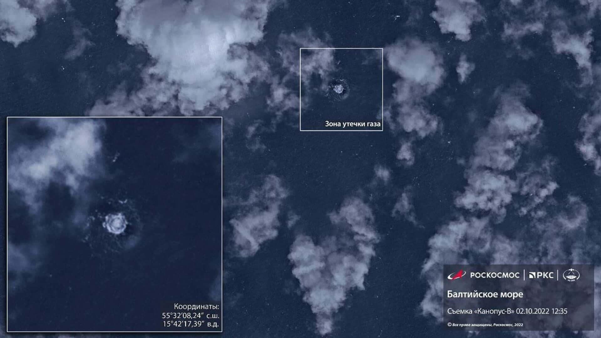 Satellite images of gas escape from the Nord Stream pipelines after the explosion on September 26, 2022, captured by Russia's Kanopus-V satellite. Photo: Roscosmos.