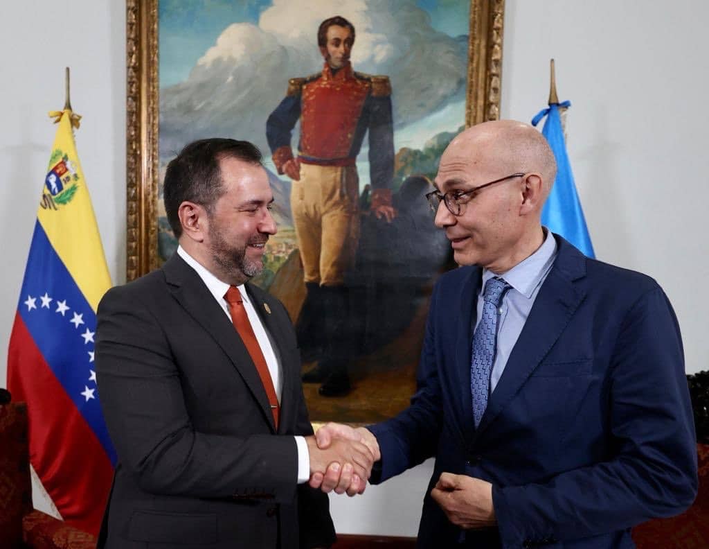 Venezuelan minister of foreign affairs, Yván Gil (left), and UN High Commissioner for Human Rights, Volker Türk (right), shaking hands in the headquarters of the Venezuelan ministry of foreign affairs. Photo: Twitter/@yvangil.
