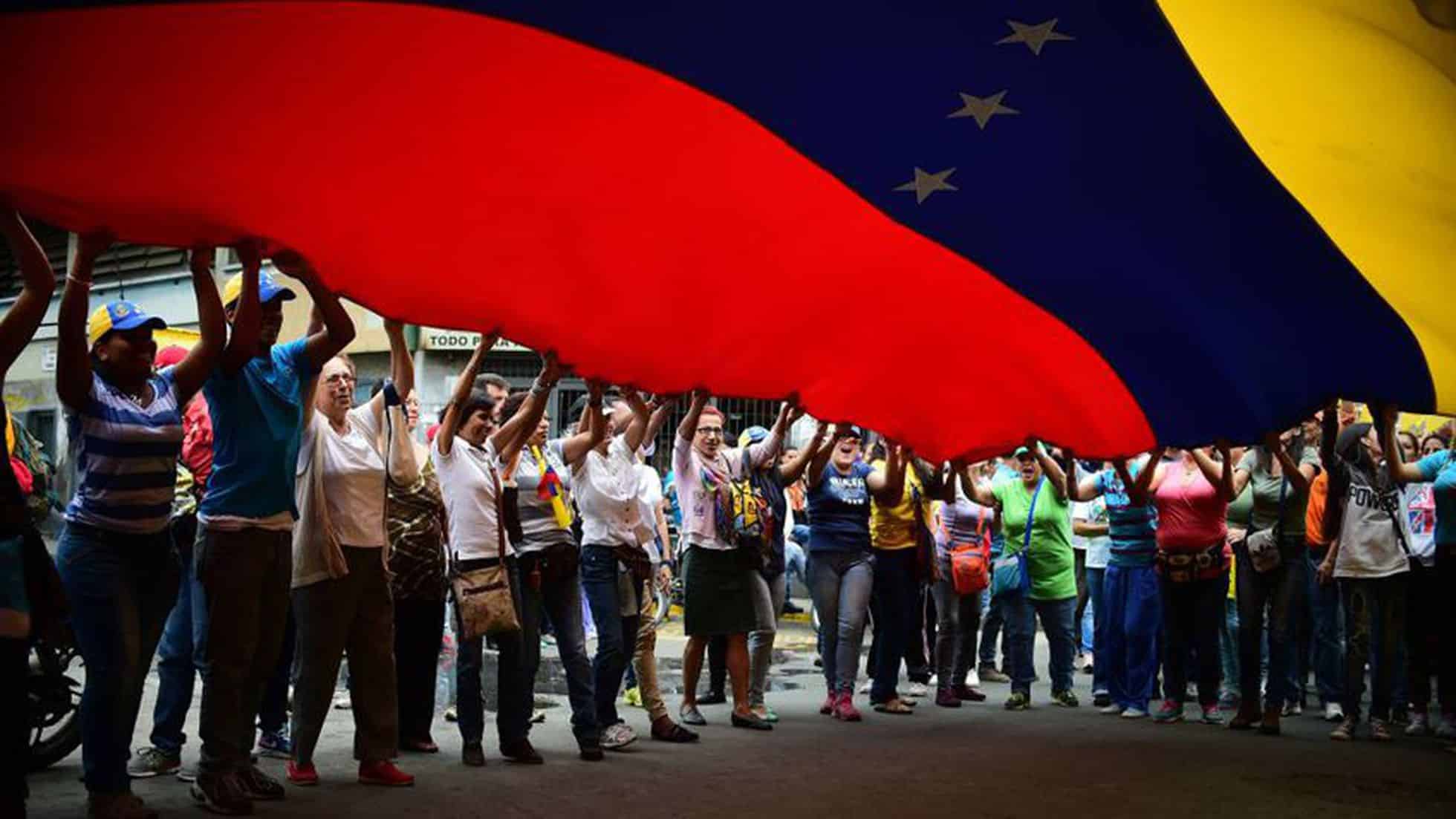 Protestors hold up large Venezuelan flag. Photo: Archive.