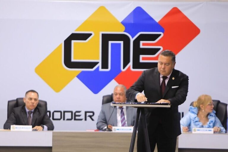 • Two persons reading a National Electoral Council sign in front ot a voting center in Venezuela ahead of the May 25 elections. Photo: Telesur.Calm in Venezuela on the Eve of Regional and Legislative Elections May 25, 2025