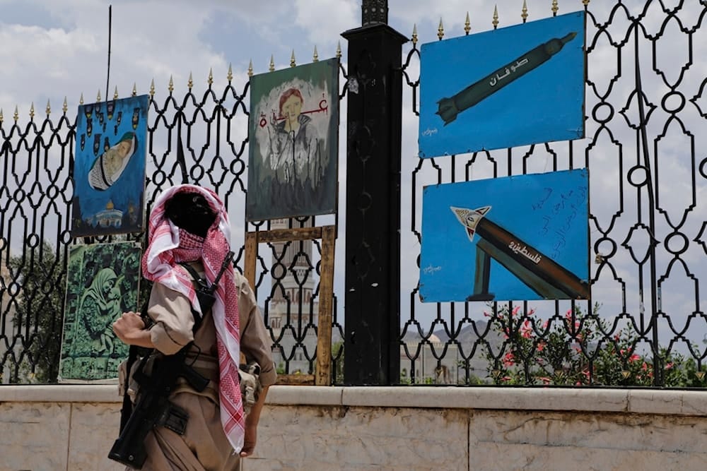 A Yemeni gunman walks past paintings of rockets and scenes of solidarity with Gaza, displayed on a fence in Sana'a, Yemen, May 5, 2025. Photo: AP.