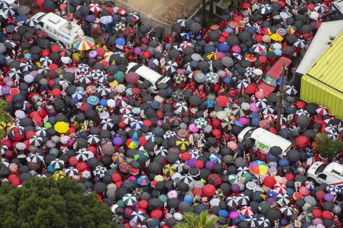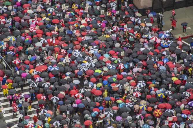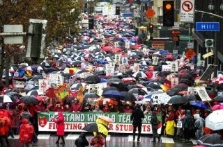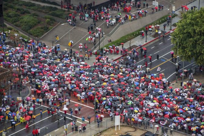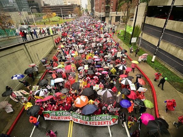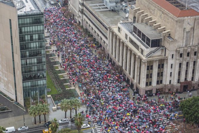 Thousands of picketing teachers and other union members — many of whom had arrived at their schools before sunrise — joined the mid-morning downtown rally in the chilly rain along with some students and parents. Police estimated the turnout at 20,000. The massive group then marched roughly a mile to school district headquarters on Beaudry Avenue.