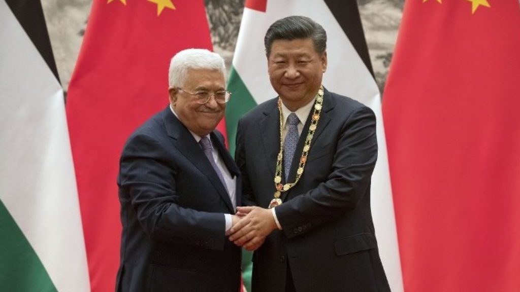 Palestinian President Mahmoud Abbas, left, shakes hands after presenting a medallion to Chinese President Xi Jinping; July 18, 2017. Photo: Reuters/Mark Schiefelbein/Pool.