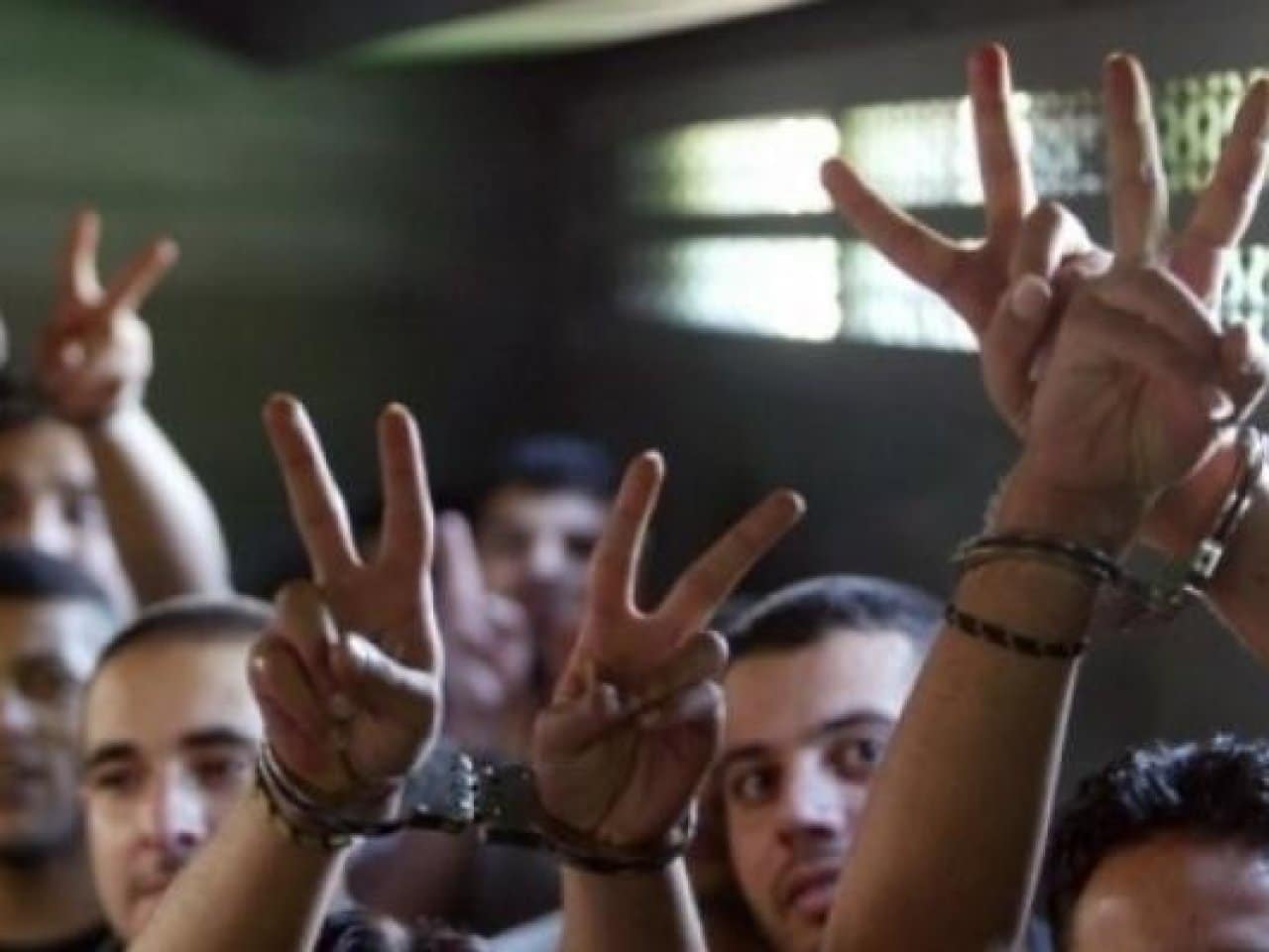 Handcuffed Palestinian prisoners show the victory sign. File photo.