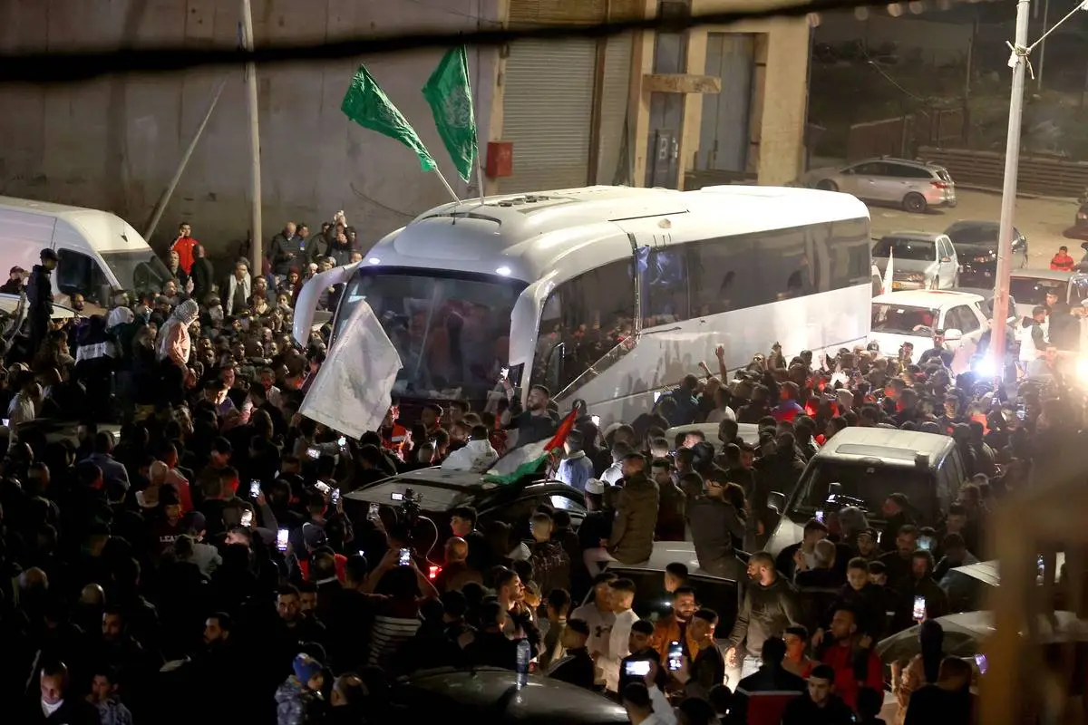 Released Palestinian prisoners arrive in Beitunia, west of Ramallah, in International Red Cross vehicles, as part of the four-day ceasefire agreement, November 24, 2023. Photo: Issam Rimawi/Anadolu Agency.