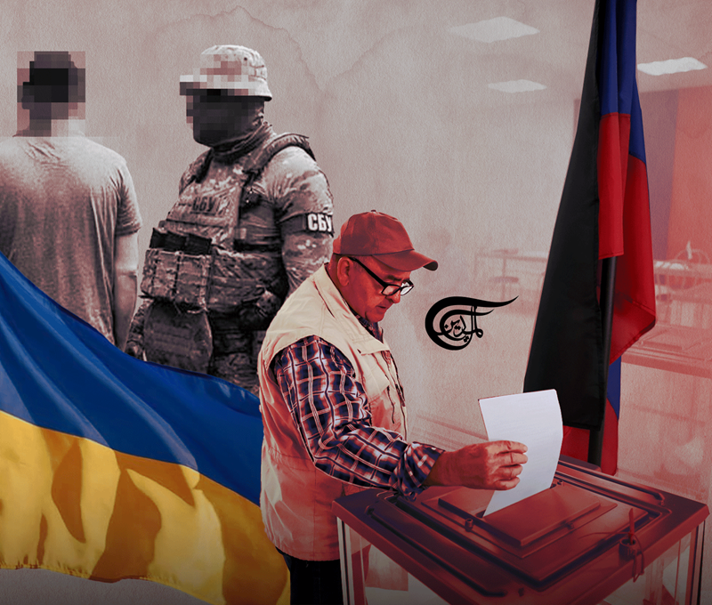 Photo composition showing a voter placing his vote in a ballot box, on the left the Ukrainian flag, on the right the Russian flag and in the background a civilian with a soldier. Photo: Al Mayadeen.