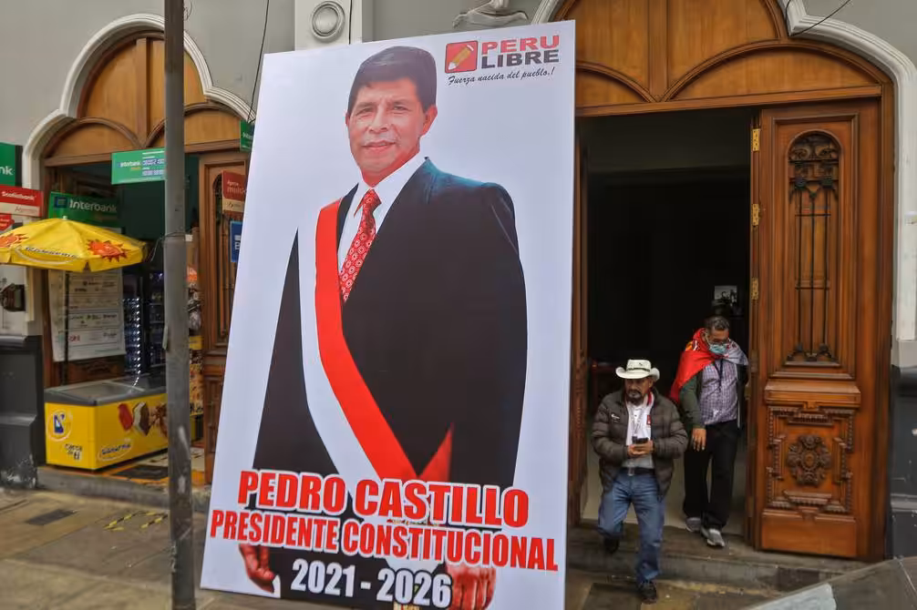 Banner of Pedro Castillo wearing as for inauguration. Peruvian elite has maneuver to delay his formal proclamation in something that many call a Coup D'Etat in the making. Photo courtesy of AFP.
