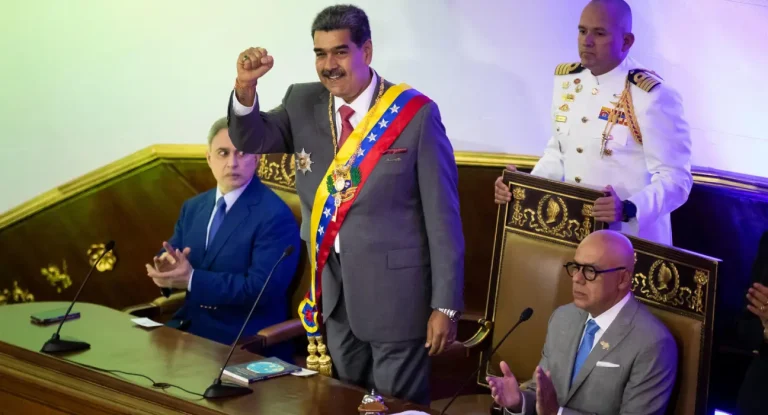 Venezuelan President Nicolás Maduro, accompanied by National Assembly President Jorge Rodríguez and Attorney General Tarek William Saab, presents his annual address at the National Assembly, January 15, 2024. Photo: EFE.