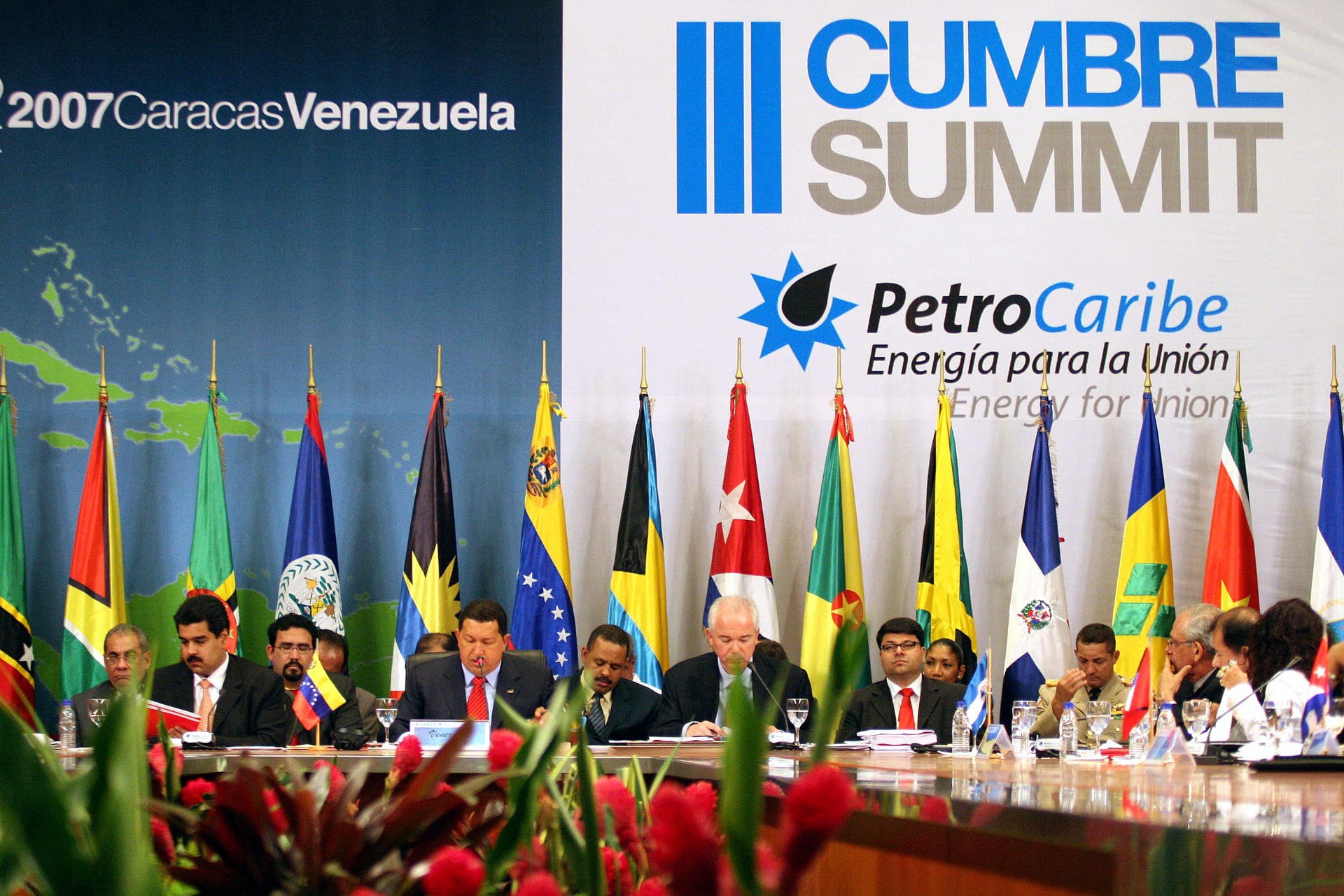 Opening session of the Petro Caribe 2007 Caracas Summit with President Hugo Chávez chairing the session along with then minister for foreign affairs, Nicolás Maduro. File photo.