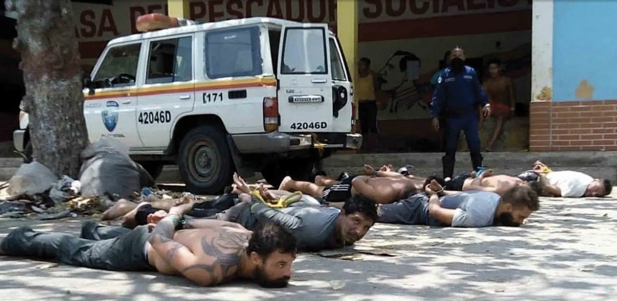 US, Colombian, and Venezuelan mercenaries, captured by Venezuelan police and military, lying on the floor in front of the House of Socialist Fishermen in Chuao, Aragua state, on May 3, 2020. Photo: Telesur/File photo.