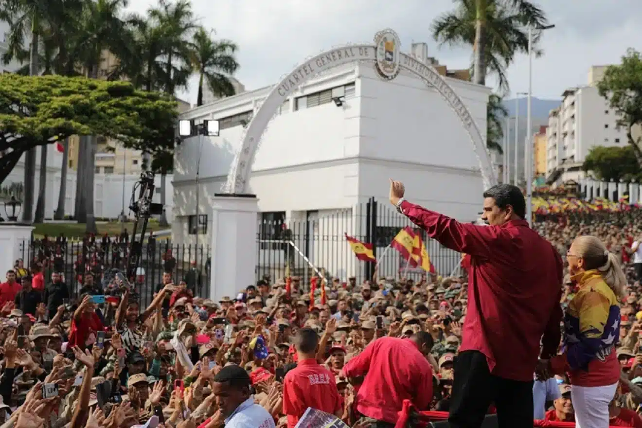 Venezuelan President Nicolás Maduro, accompanied by his wife, National Assembly Deputy Cilia Flores, at a political rally to celebrate the 21st anniversary of the failed coup d'etat against President Hugo Chávez in 2002. Photo: Presidential Press.