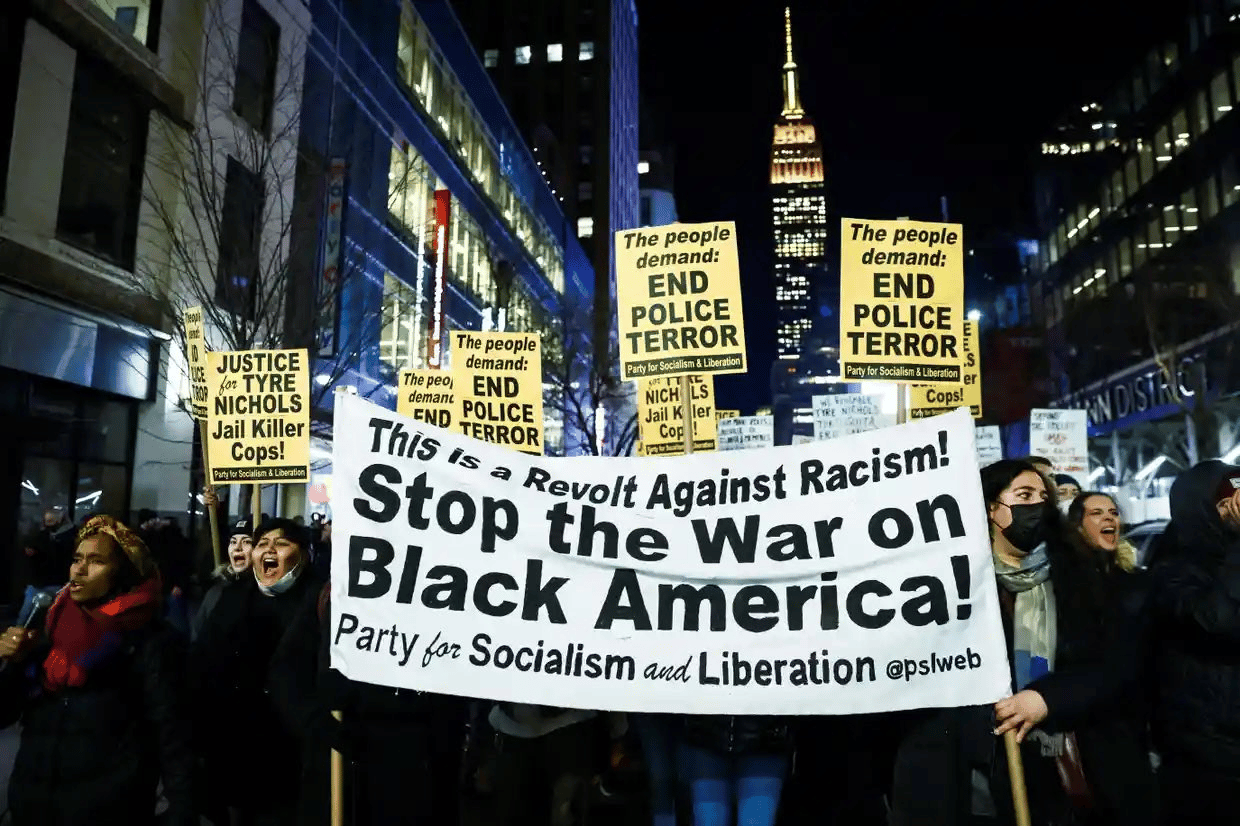 Protesters in New York City condemning the brutal murder of Tyre Nichols by five Memphis (TN) police officers. Photo: Party of Socialism and Liberation.