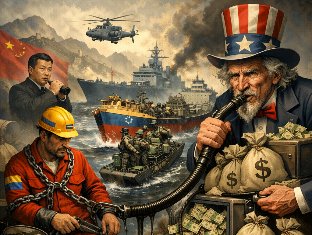 Reuters sells custodial plunder as a pricing issue, turning blockade into “market caution.” We restore the missing record: seizures, supervision, and the re-routing of Venezuelan oil revenue through imperial hands. We reframe the contradiction as doctrine—Fortress America tightening hemispheric command as multipolar escape routes multiply. We close with a call to organize: break the information blockade, target the choke points, and build material solidarity with the besieged.