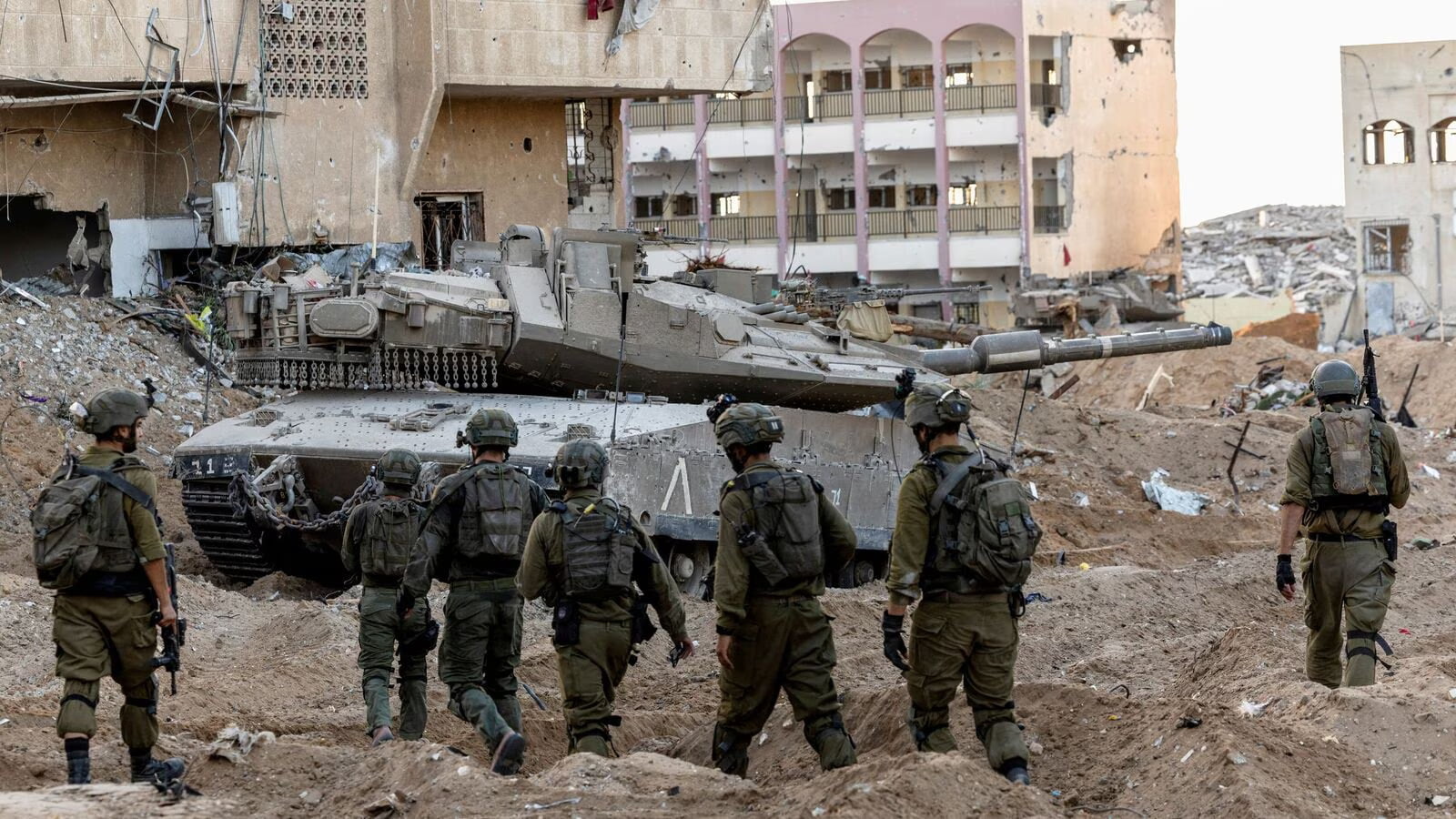 Israeli army personnel and a tank in a detsroyed neighborhood of Gaza City. Photo: Reuters.