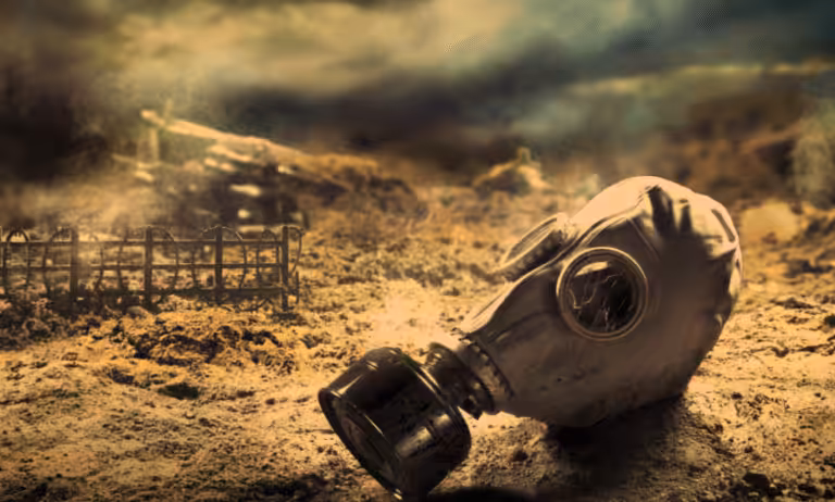 Featured image: A gas mask lies in a desolate and ominous landscape. Photo: RedRadioVe.