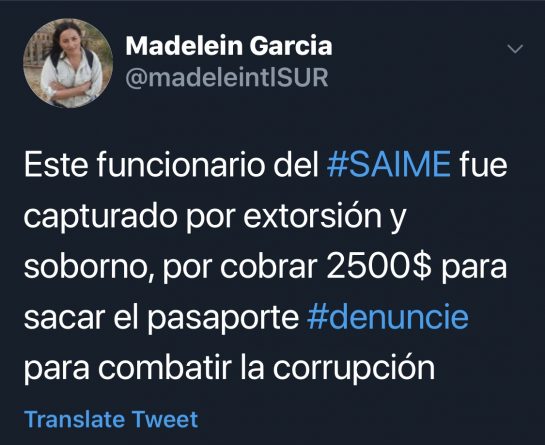An official of the Administrative Service of Identification, Immigration and Aliens (Saime) [agency in charge of issuing passports and ID’s] was detained for extortion and bribery, when requesting two thousand 500 dollars to a citizen to obtain the passport.
