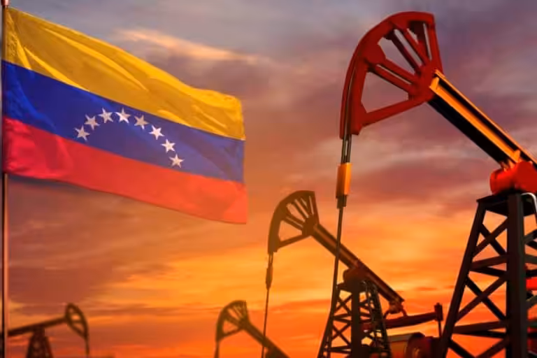Photo composition showing oil rigs next to a Venezuelan flag. Photo: Shutterstock/Anton_Medvedev.
