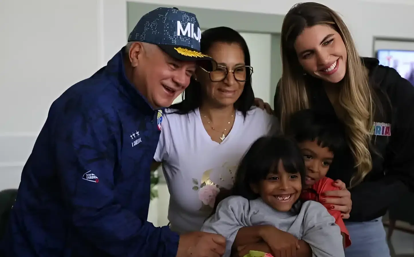 Venezuela's Interior Minister Diosdado Cabello, alongside Camilla Fabri, head of the Return to the Homeland Program, next to a reunified family. Friday, July 25, 2025. Photo: IG/@mijpvzla.