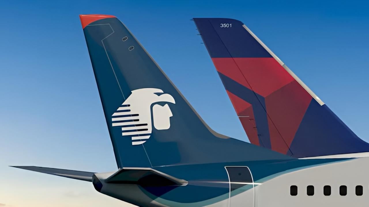 Tails of Delta and Aeromexico passenger jets. File photo.