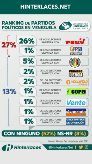 The United Socialist Party of Venezuela (PSUV) leads in the preference of the Venezuelan electorate, as evidenced in the recent Monitor País Hinterlaces 2021 survey, which was carried out between April 14 and 25. According to this survey, PSUV obtained 26% of the preferences in the ranking of political parties in Venezuela, while the alliance Great Patriotic Simón Bolívar Pole reached 1%.
