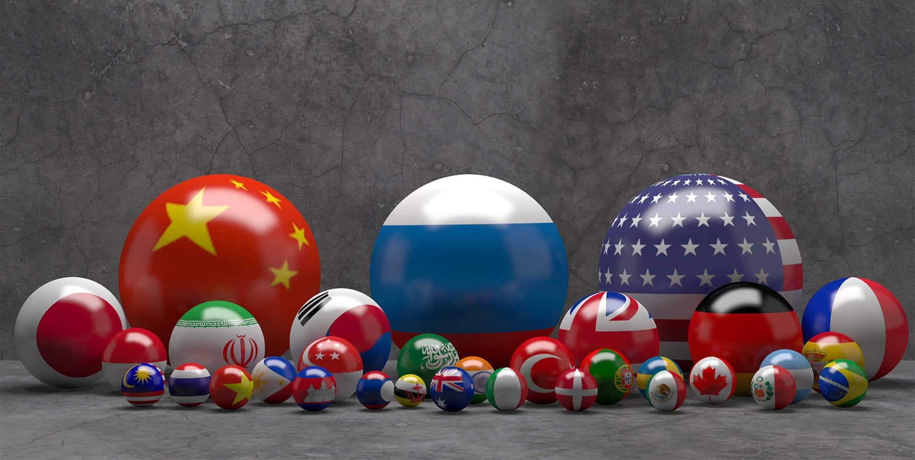 Photo composition showing pool balls with flags of different countries. China, Russia and the US are the biggest balls while Japan, India, South Korea, UK, Germany and France follow in size along 21 smaller flags. Photo: Russian International Affairs Council.