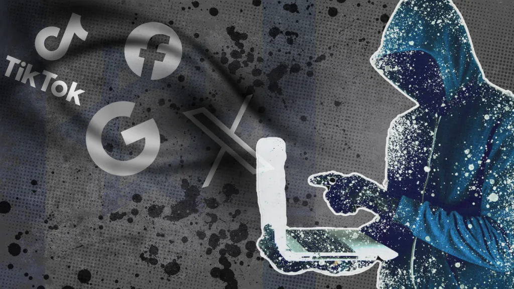 An image composition featuring a hooded figure using a laptop, superimposed with the logos of TikTok, Google, Facebook, and X. Photo: MintPress News.