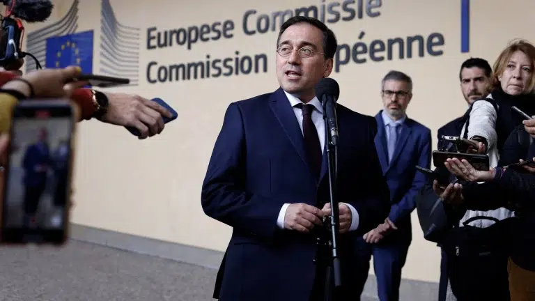 Spanish Foreign Minister José Manuel Albares speaks to the press before a meeting of the European Commission in Brussels, May 16, 2024. Photo: Kenzo Tribouillard/AFP.