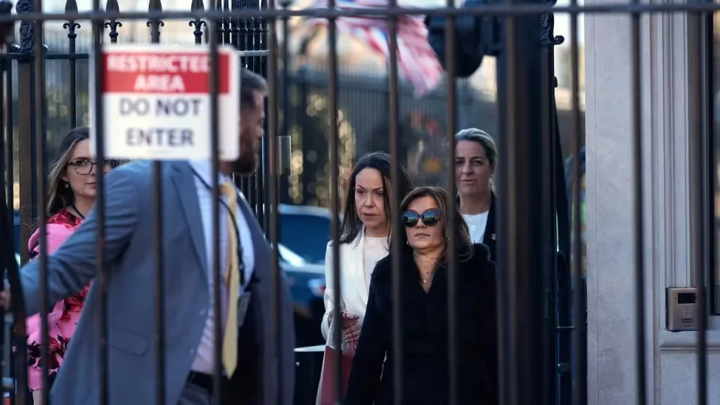 Venezuelan Acting President Delcy Rodríguez enters the National Assembly, escorted by its President Jorge Rodríguez and Interior Minister Diosdado Cabello, to deliver the annual message to the nation on Thursday, January 15, 2026. Photo: Ronald Peña R./EFE.
