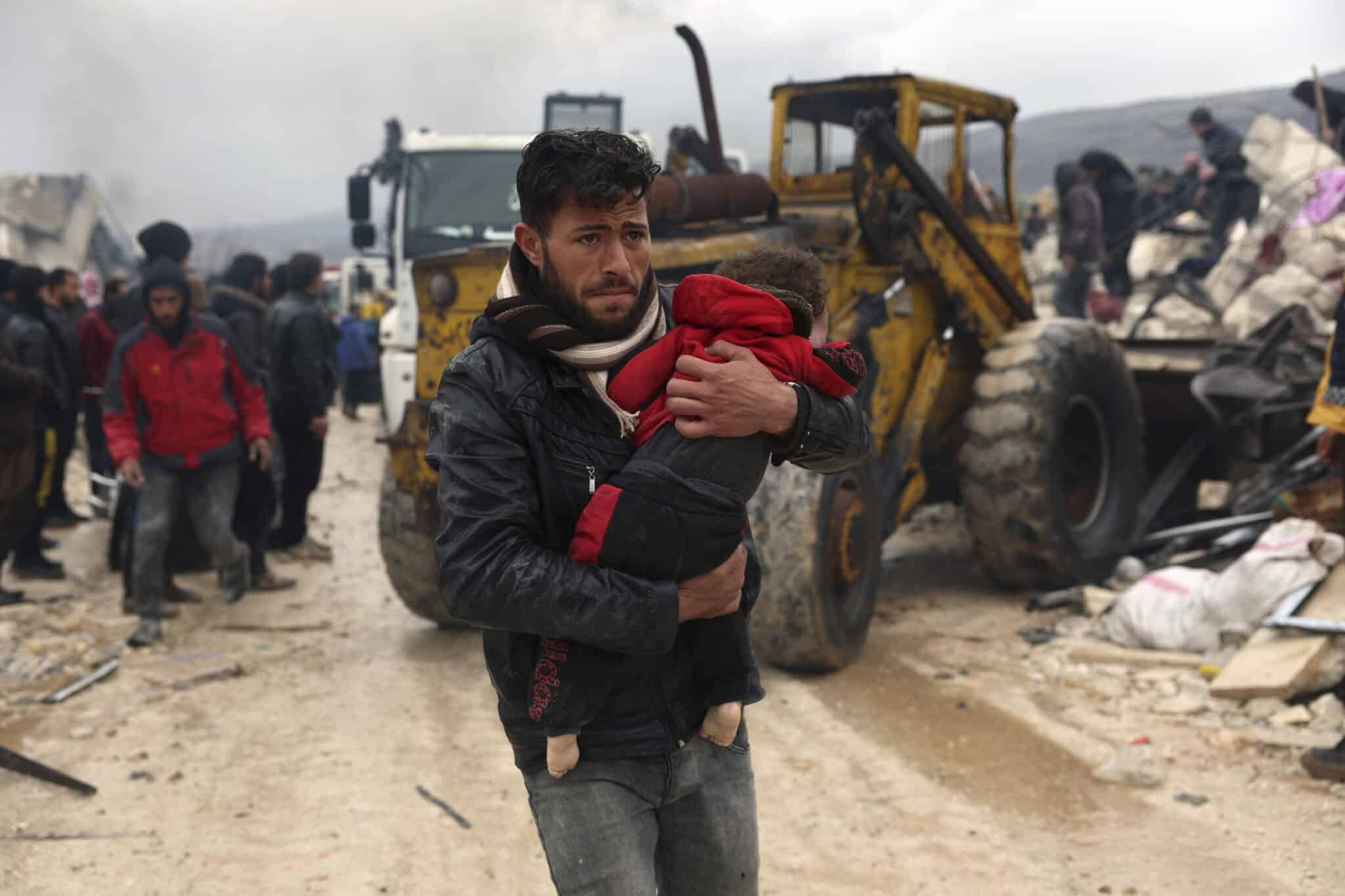 A man carries an earthquake victim in Besnia, a village near the Turkish border, Idlib province, Syria. Photo: AP/Ghaith Alsayed.