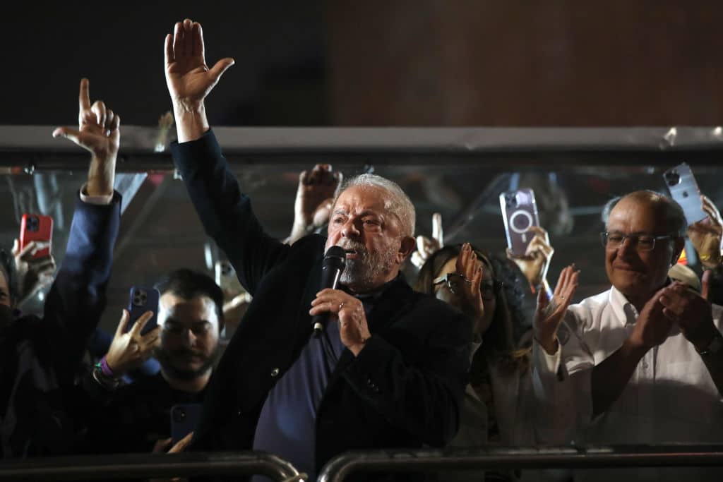 SAO PAULO, BRAZIL - OCTOBER 02: Former president of Brazil and candidate of Worker's Party (PT) Luiz Inacio Lula da Silva speaks to supporters at the end of the general election day at Paulista avenue on October 02, 2022 in Sao Paulo, Brazil. According to official results, Candidate Luiz Inácio Lula da Silva of Workers’ Party (PT) has 48% of the votes and Incumbent and candidate Jair Bolsonaro of Liberal Party (PL) 43,57%, with 97,93 of the voting counted. Lula and Bolosonaro will compete in the presidential runoff on October 30, 2022. (Photo by Rodrigo Paiva/Getty Images)