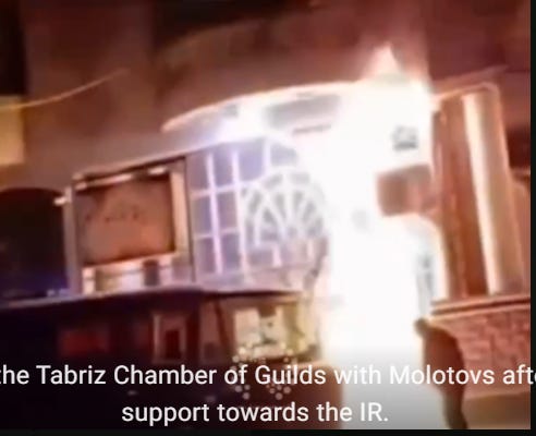 January 3, Tabriz. Rioter uses Molotovs to try to set the Tabriz Chamber of Builds building on fire. Cellphone footage.