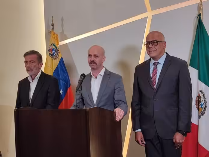 Featured image: Gerardo Blyde, Dag Nylander, and Jorge Rodríguez presenting the joint statement on the third round of the Venezuelan dialogue in Mexico City. Photo: Twitter / @enpaiszeta