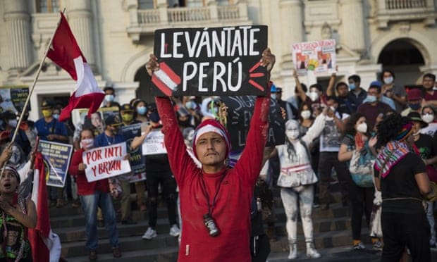 Featured image: A performer holds a sign that reads in Spanish ‘Wake up Peru’ during a protest in Lima on Saturday. Nine out of 10 Peruvians opposed the ousting of Vizcarra, a recent poll found. Photograph: Rodrigo Abd/AP