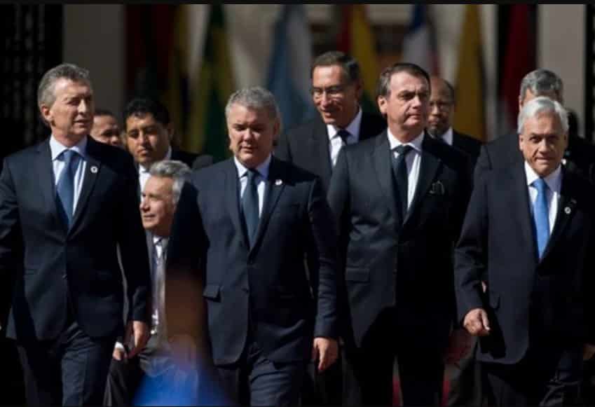 From right to left, former Chilean president Sebastian Pinera, Brazilian president Jair Bolsonaro, Colombian former president Ivan Duque, Ecuadorian former president Lenin Moreno and Argentinian former president Mauricio Macri. All these presidents marked an epoch of strong turn to the right in Latin American politics with governments strongly subservents to US interests. Photo: Esteban Félix/AP.