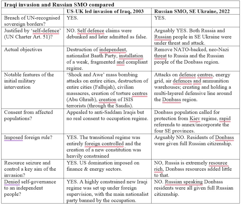 The Anglo-American aims in Iraq were very different to those of the Russian SMO. Both claimed to act in the name of local people, but only the former imposed foreign rule. The ‘Shock and Awe’ approach in Iraq, and the devastation of the cities of Baghdad and Fallujah, were acts aimed at achieving “rapid dominance” through “massive and therefore indiscriminate bombing” (Ullman and Wade 1996). Both invasions breached UN-recognised sovereign boundaries, but the Russian claim of self-defence had substance, while that of the Anglo-Americans in Iraq did not.