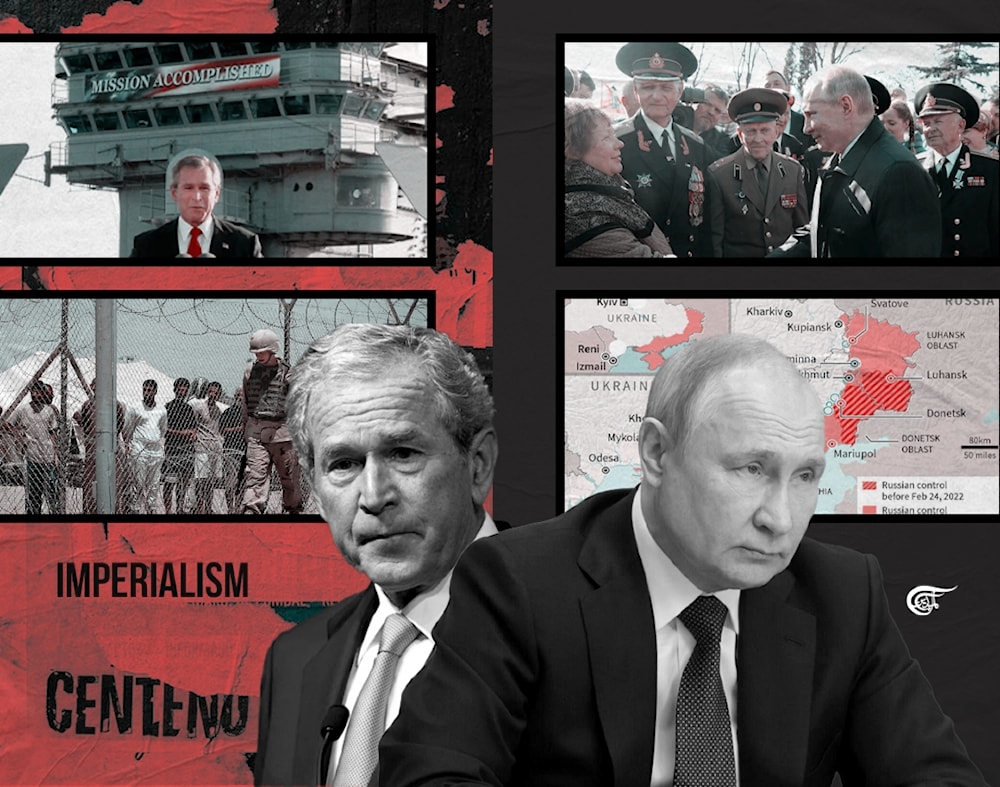 Photo composition showing George Bush Jr. (left) next to a caption that reads "Imperialism," and Russian President Vladimir Putin next to a map of the Dombass regions and a photo of him greeting a woman next to military officers. Photo: Al Mayadeen.