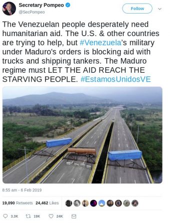 The photo depicts Tienditas International Bridge, blocked by a fence, a few concrete blocks, two containers and an oil tanker. This photo along with Pompeo’s words paint an image of Maduro as a mad dictator who does not care about the people of his country, and is willing to shut down and blockade a huge six-lane highway in order to stop them eating.