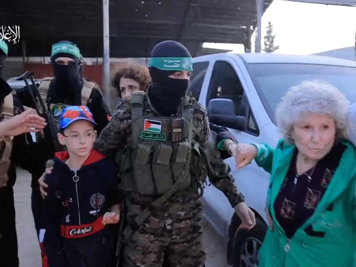 A group of prisoners held by the Palestinian Resistance since October 7 being release on Friday, November 24, 2023. Photo: Al-Qassam Brigades video.