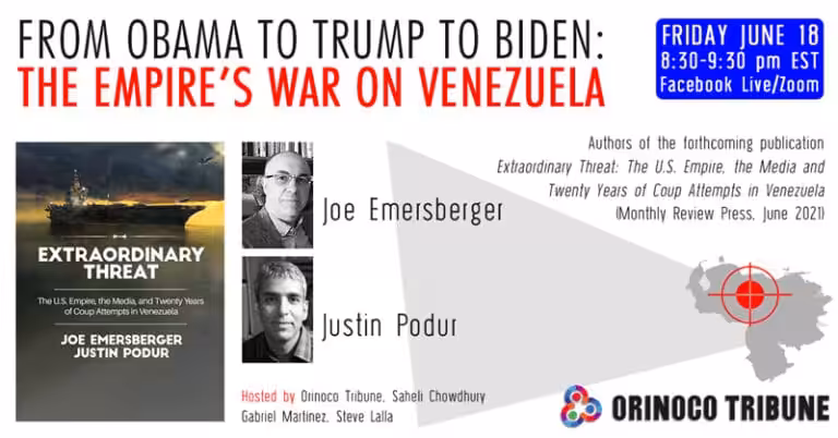On Friday, June 18, Orinoco Tribune will host a live discussion with Joe Emersberger and Justin Podur, authors of the new publication Extraordinary Threat: The US Empire, the Media, and 20 Years of Coup Attempts in Venezuela, forthcoming from Monthly Review Press.