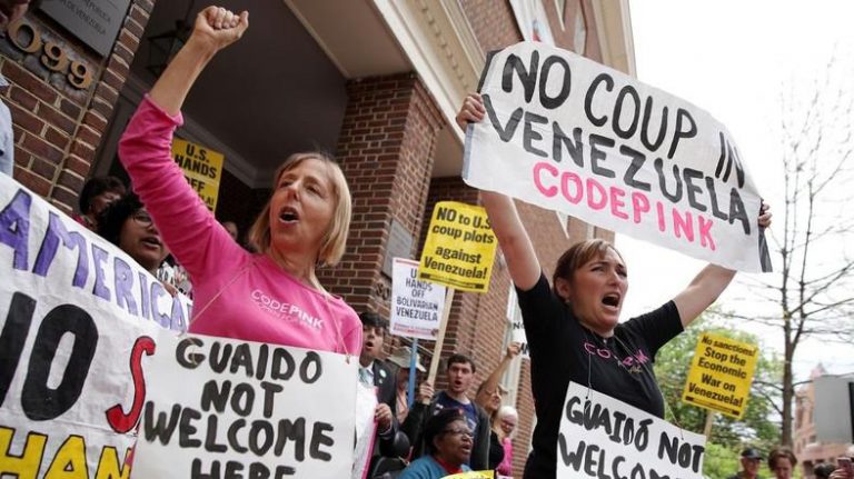 On Thursday, Elliott Abrams–right after our own Ariel Gold disrupted his talk–accused us of breaking the law by living in the embassy. This is quite ironic coming from a man who has been involved in war crimes and was convicted of lying to Congress (he was pardoned by George H.W. Bush). We aren’t breaking the law, but Abrams has and is now in the process of breaking international law by trying to orchestrate a coup.