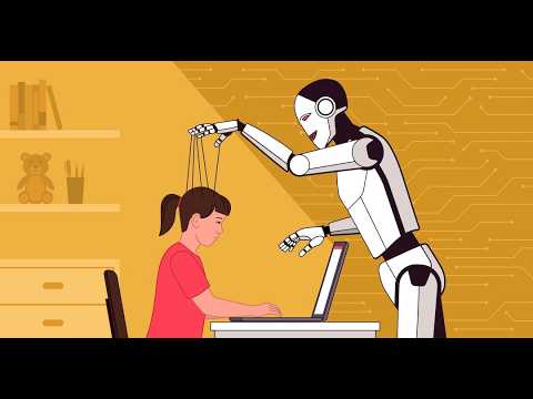 An AI robot controlling a child's mind, styled like a puppet master manipulating a marionette while the child interacts with a laptop. Photo: Caitlin Johnstone.