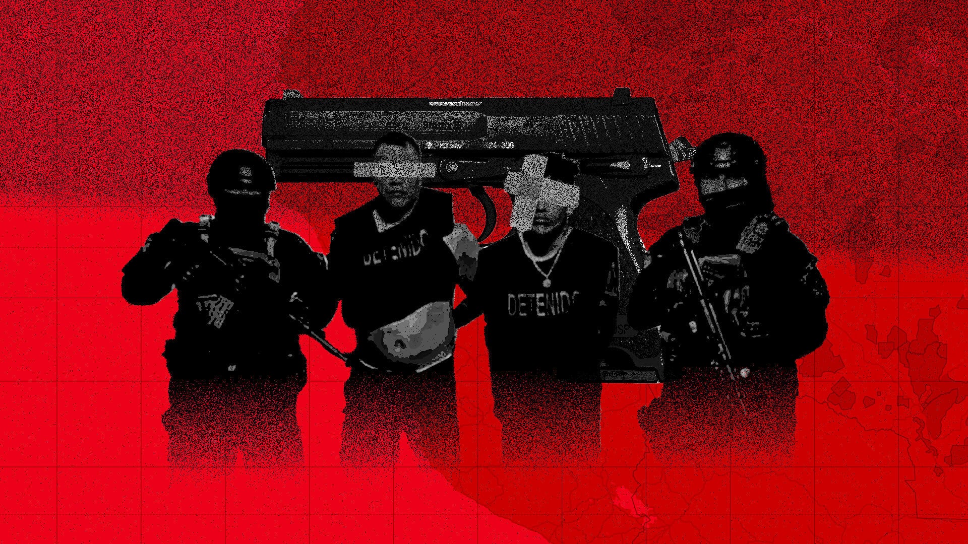 Photo composition showing two criminals captured by police officers, with a firearm in the background. Photo: Ojo Público/file photo.