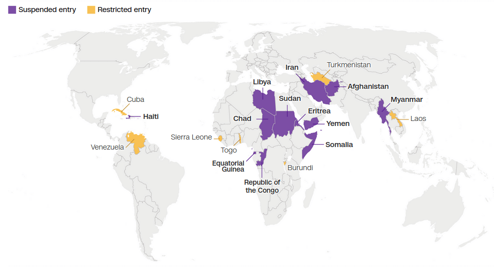 Cuba and Venezuela face partial restrictions. For both countries, the suspension applies only to new visas or individuals lacking valid visas when the proclamation takes effect.