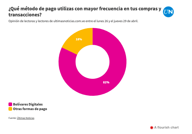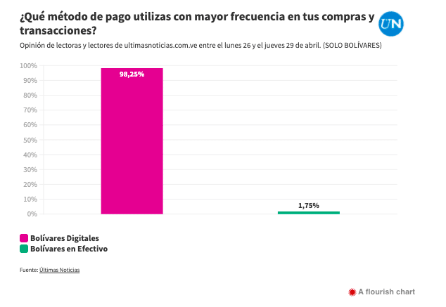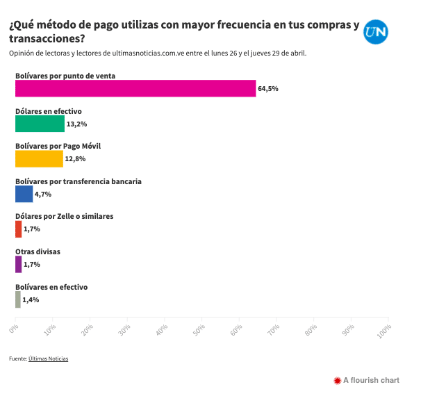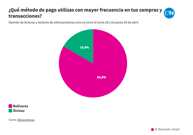 The options were: bolívars at points of sale, bolívars in bank transfers, bolívars for mobile payments, bolívars in cash, dollars in cash, dollars in Zelle or similar payment gateways, and other foreign currencies. From Monday, April 26 through Thursday, April 29, 2,950 responses were received, and the result was—the bolívar is alive!
