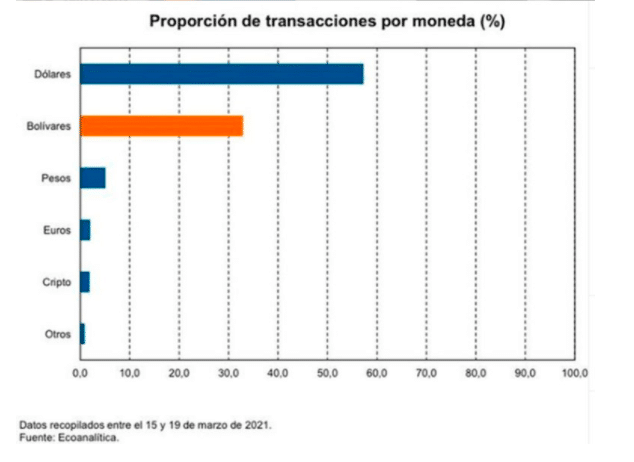 Últimas Noticias also looked for other data with the purpose of comparing with this survey and found that the private consultancy firm Econanalítica had published, in its social media accounts, the result of a study carried out in March on this very same topic. In an Instagram publication the organization asserts that commercial transactions by currency at national level are: dollars 57.3%, bolívars 32.9%, Colombian pesos 5.1%, euros 2%, and cryptocurrencies 1.9%. It claims that “67.1% of payments were made with a currency other than bolívar.”