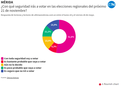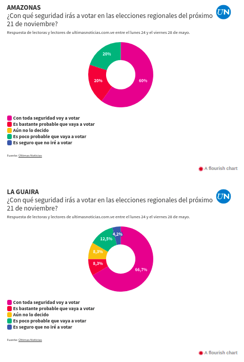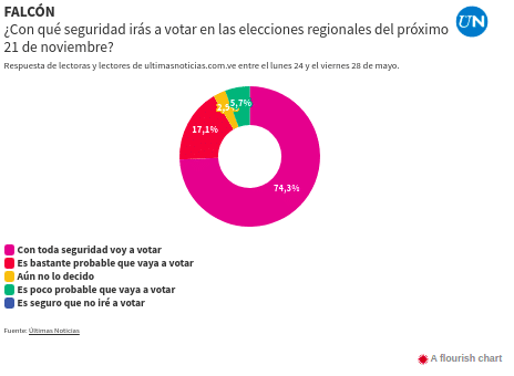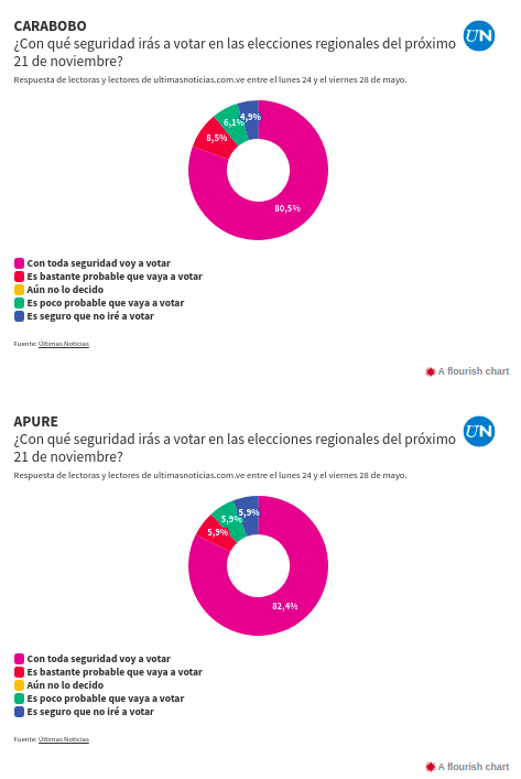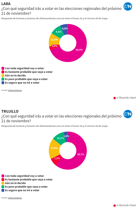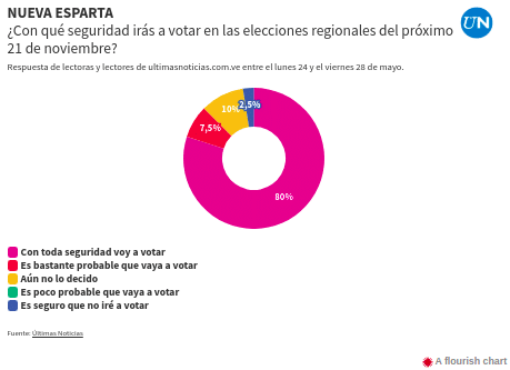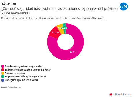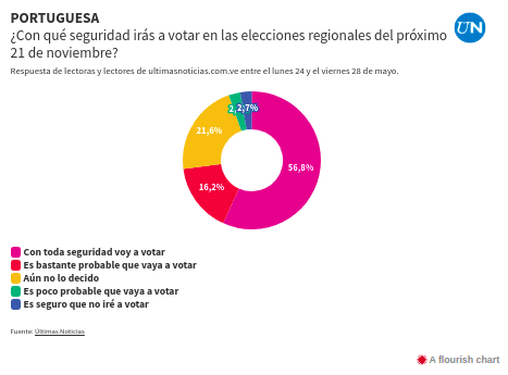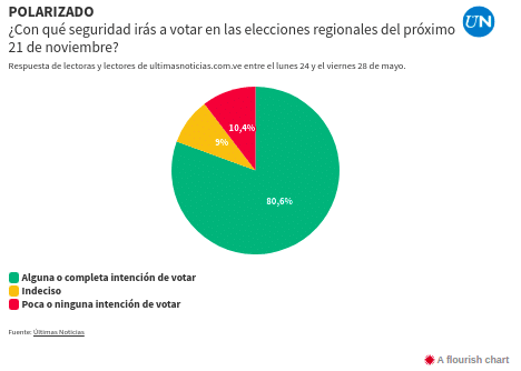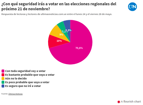 This week Últimas Noticias conducted a poll on the intention to vote in the upcoming elections, scheduled for November 21. For the responses, a Likert scale type design was used, where the options were: I will certainly vote; it is quite likely that I will vote; I have not decided yet; it is unlikely that I will vote; and it is certain that I will not vote. Hence, the survey measures the degree of intention or decision that people have regarding going to vote in the regional elections at this moment, six months before the day of the vote.