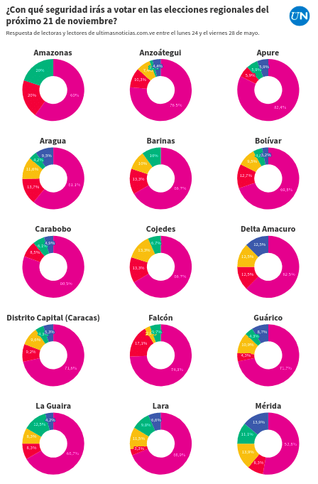This digital survey was carried out through the ultimasnoticias.com.ve website and Últimas Noticias social media accounts. Participation was free and voluntary, and all the responses were considered for the survey. The poll was conducted between Monday, May 24 and Friday, May 27, and 1,416 unique responses were received. Participants were asked in which state they vote and how likely it is that they will go to vote on November 21. In this way, a chart of the intention to go to vote was obtained, both on the national level and at the level of individual states.