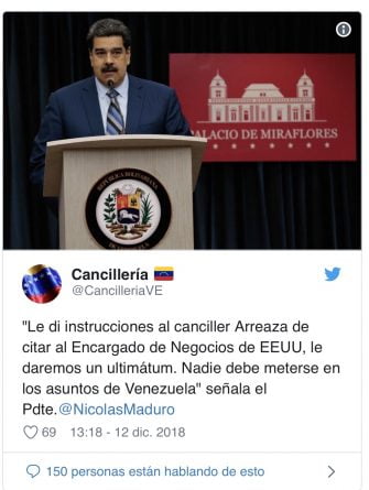 “I instructed Foreign Minister Arreaza to summon the US Charge d’Affaires, we will give him an ultimatum. Nobody should get involved in the affairs of Venezuela,” Maduro said during a press conference with national and international media from the Simón Bolívar Press Room at the Miraflores Palace.