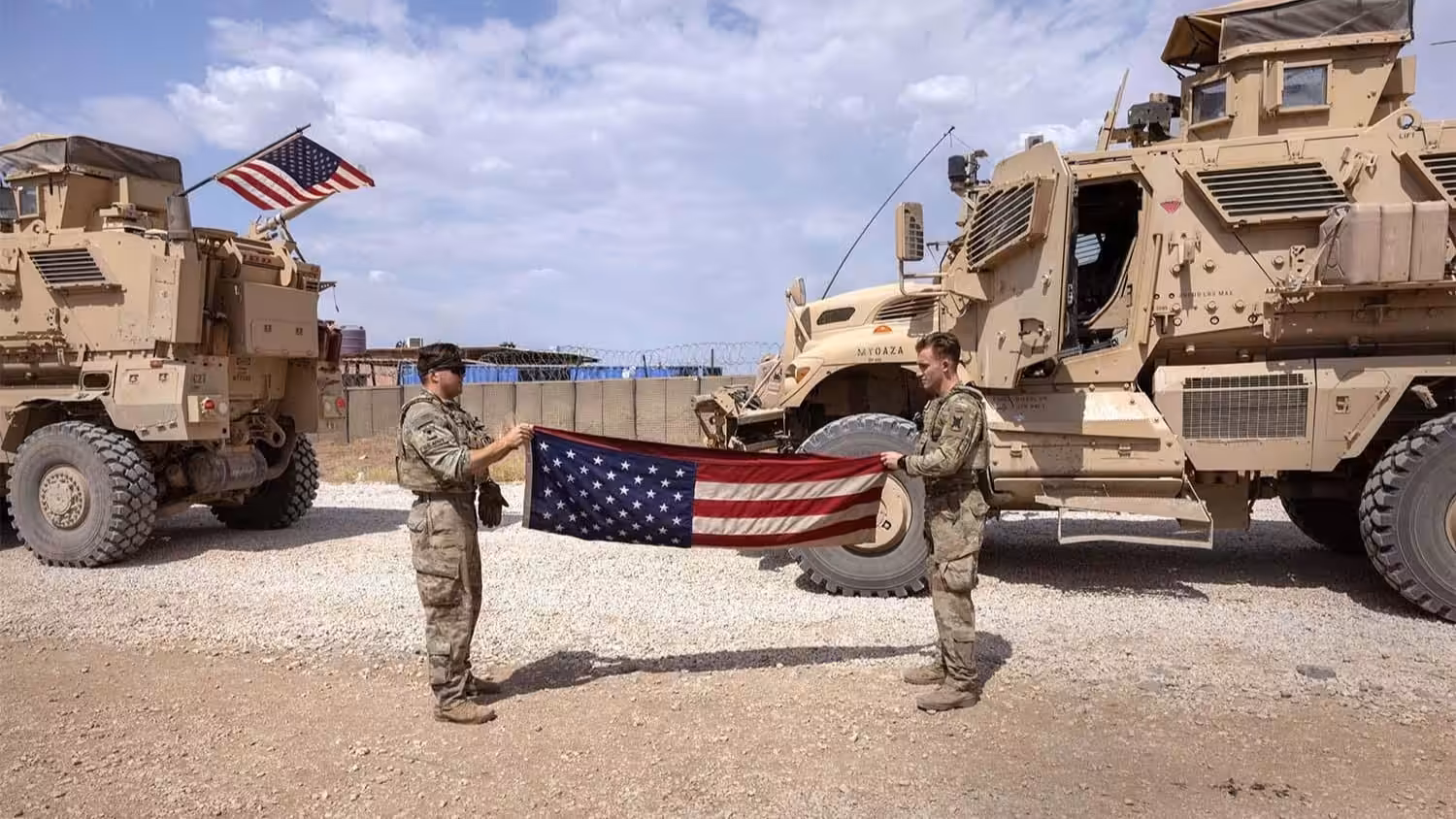 Two US soldiers folding their flag and in the back two war trucks. Photo: The Cradle.
