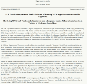 U.S. Justice Department Seeks Seizure of Boeing 747 Cargo Plane Grounded in Argentina